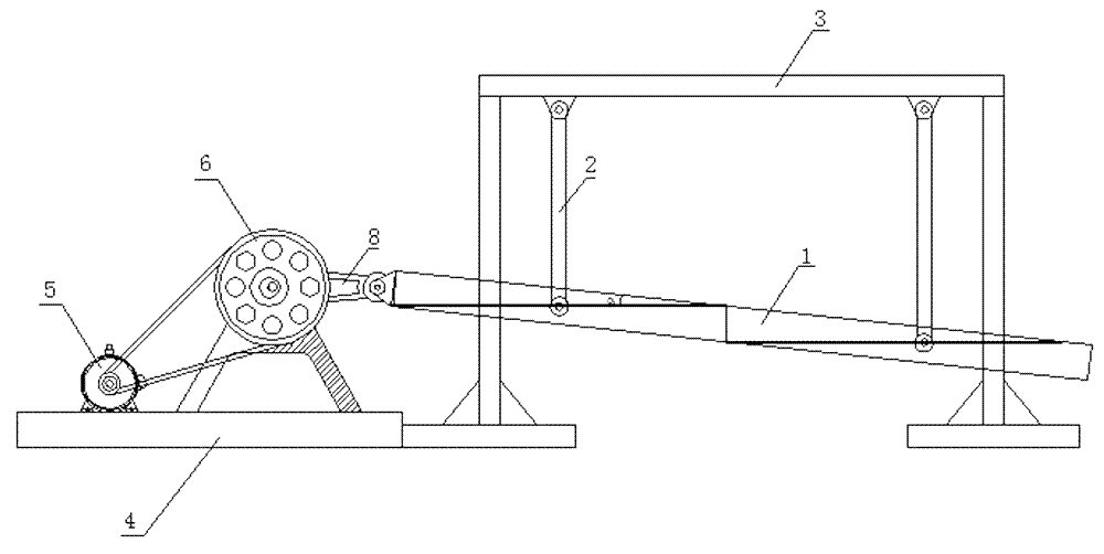 1、網(wǎng)架 2、懸吊裝置 3、支撐梁 4、傳動底托 5、傳動電機 6、 偏心往復(fù)裝置 8往復(fù)臂