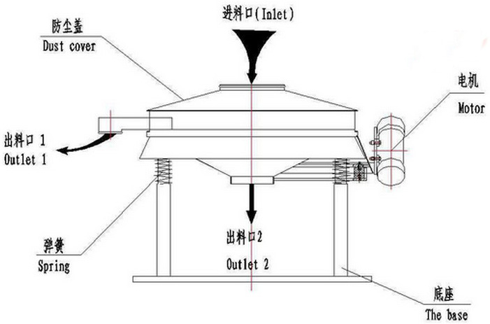 2:旋振篩是直立式電機(jī)作激振源,電機(jī)上、下兩端安裝有偏心重錘,將電機(jī)的旋轉(zhuǎn)運動轉(zhuǎn)變?yōu)樗?、垂直、傾斜的三次元運動,再把這個運動傳遞給篩面。調(diào)節(jié)上、下兩端的相位角,可以改變物料在篩面上的運動軌跡。旋振篩是一種高精度細(xì)粉篩分機(jī)械,其噪音低、效率高,快速換網(wǎng)需3-5分鐘,全封閉結(jié)構(gòu),適用于粒、粉、粘液等物料的篩分過濾。