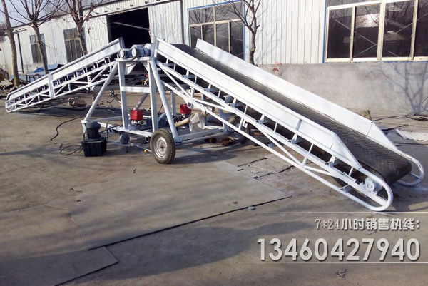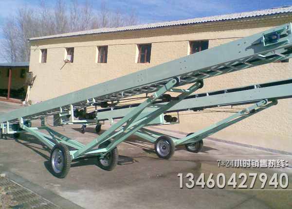 可移動(dòng)式膠帶輸送機(jī)適用于散狀物料或成件物品的短途運(yùn)輸和裝卸工作。采用鋼管結(jié)構(gòu),輕巧美觀,機(jī)動(dòng)性好。轉(zhuǎn)動(dòng)裝置為電動(dòng)滾筒,并配有充氣輪胎和鋼輪兩種行走輪。機(jī)長(zhǎng)10米以上傾角可調(diào)。